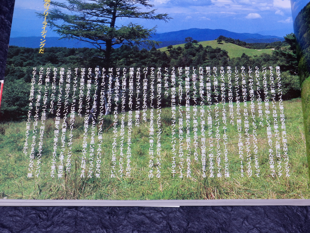 初めて補助輪なしの自転車に乗れたときに感じた、「これさえあればどこへでも行ける!」という、世界が急にグンと広がっていくような感覚が、僕の身体に満ちた。マウンテンバイクってスゲエ!と、心から思った。