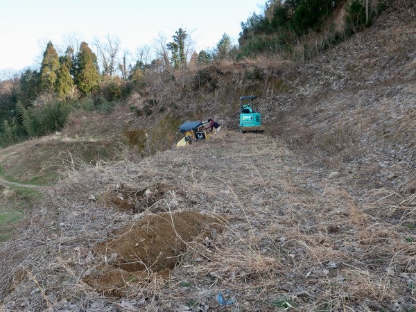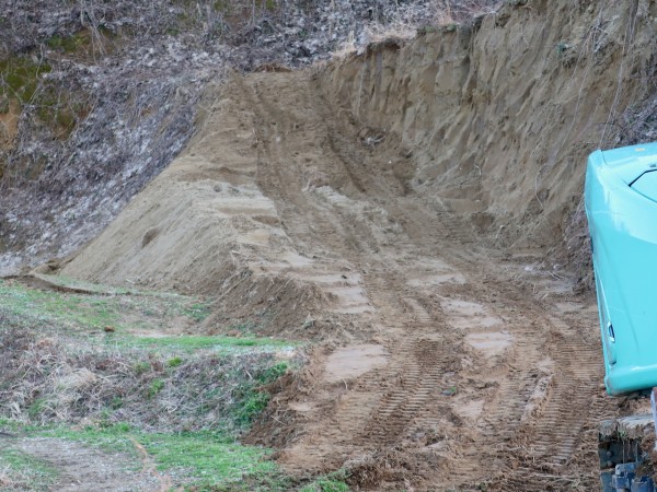 候補地その1では、この絶壁に作業道を開通させました。ユンボのパワーは恐るべしで、思っていた以上にいいスロープができました。